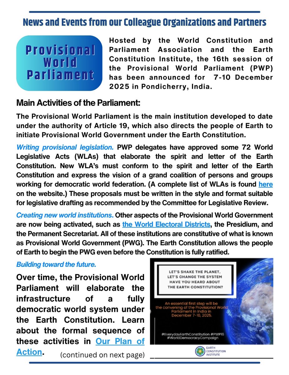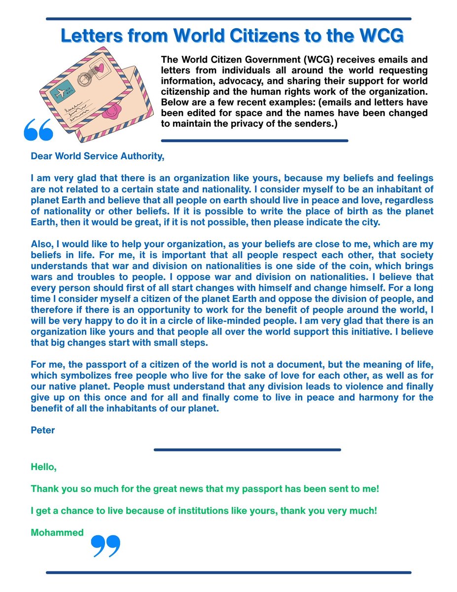 Founded in 1953, the World Citizen Government (WCG) is the political embodiment of world citizenship linked to world law. The WCG promotes respect for universal rights. The WCG affirms everyone’s right to identify as world citizens and issues documents of global identification and travel.